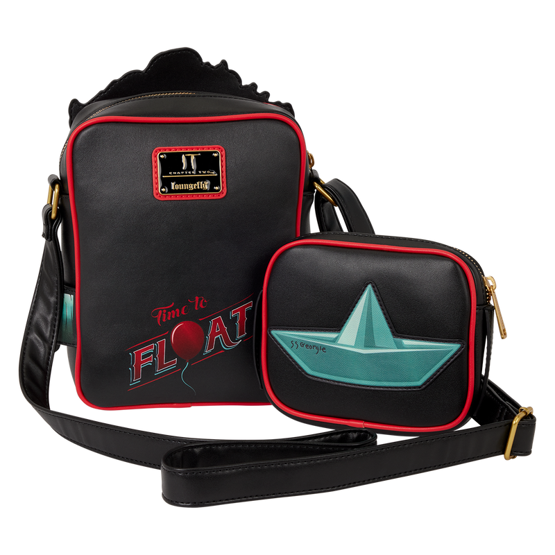 Everyone's favorite dancing clown appears in applique detail on the bag. His arms reach around to hug the removable, reversible coin bag. One side of the coin bag features a red balloon and the other side features Georgie's boat. On the back of the bag, you'll find Pennywise's signature phrase, "Time to Float."