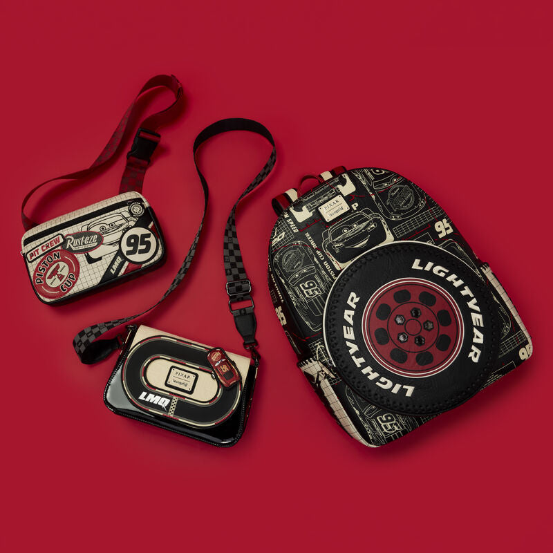 This crossbody features a racetrack on the front flap. An applique of Lightning McQueen actually moves around the track! Pretty epic, right?! The body of the bag is made of glossy patent faux leather for an elevated feel. You'll find "95" written on the back of the bag and a checkered pattern on the crossbody strap.