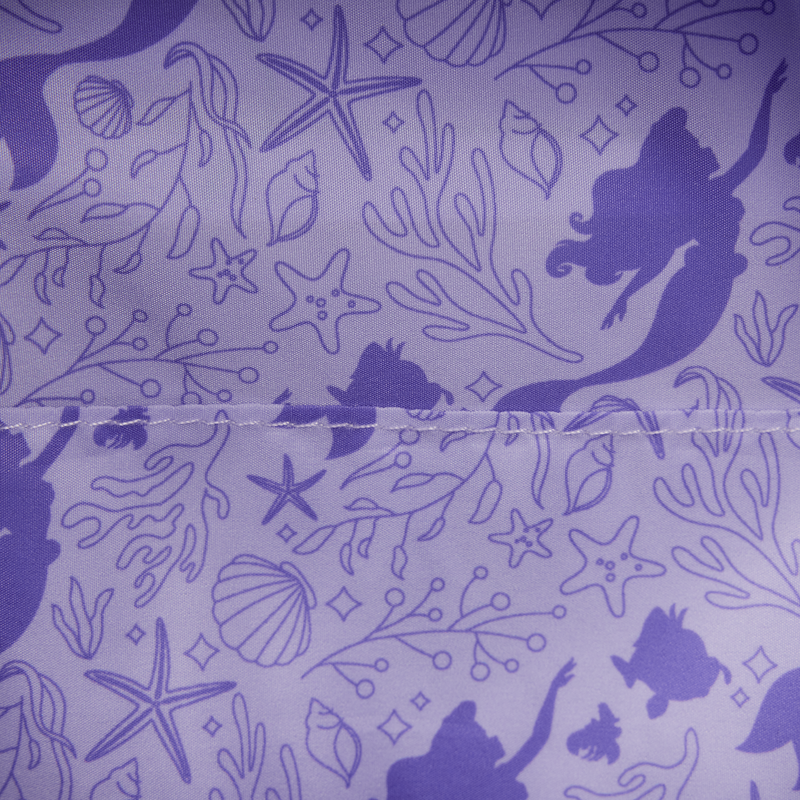 The bag is crafted from purple-to-green iridescent fish scale polyurethane that shimmers and shifts with every movement – just like Ariel's iconic tail. Faux pearls adorn the front and side pockets, and a 3D bow at the top of the bag features an enamel seashell charm with tulle and faux pearls – an incredibly intricate finishing touch. Check out the straps to find a purple seashell appliqué – a detail that true Ariel fans will immediately love. This Loungefly mini backpack pairs perfectly with the Little Mermaid Tote Bag for a complete under-the-sea collection! Makes a part-of-your-world gift for Disney Classics fans!